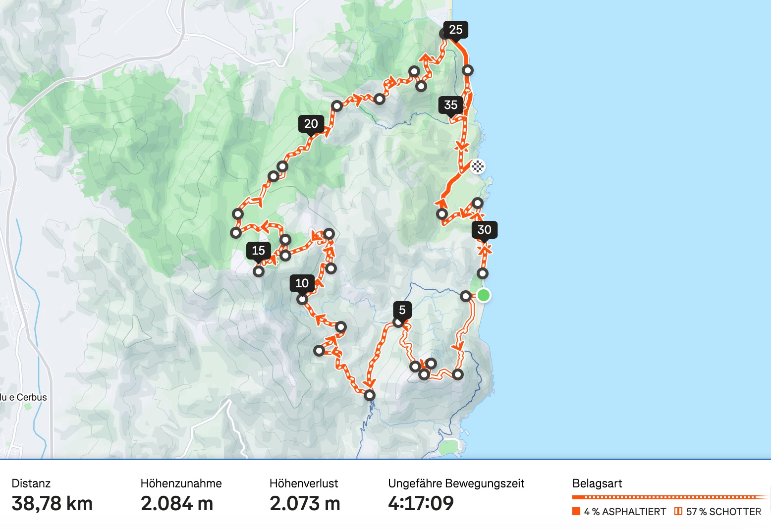 Ausgehend vom Campingplatz Coccorrocci führt dieser Long Run zuerst über steile und unwegsame Pfade rund um die Punta Cartucceddu, später aber über laufbarere Wege auf den Monte Ferru und weiter über wunderschöne Singletrails im steten Auf und Ab von Vegetation und Gelände zurück zum Meer.