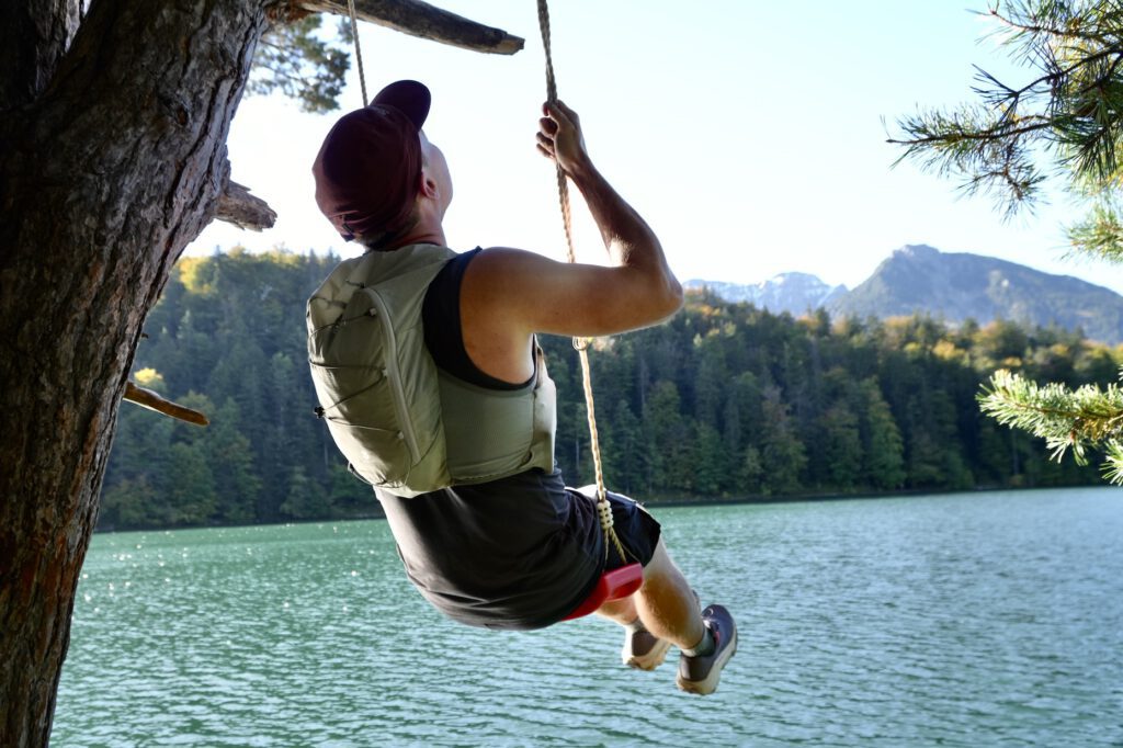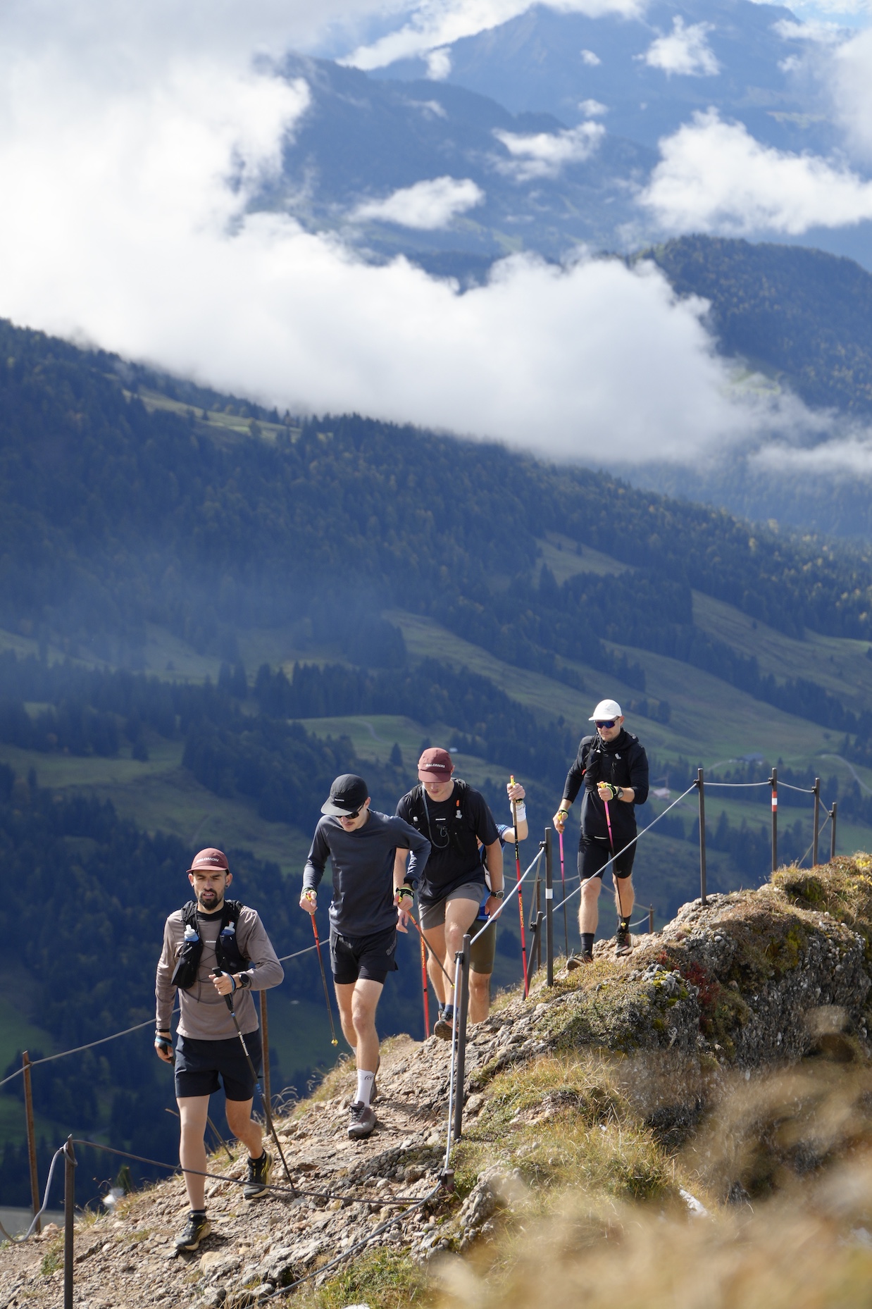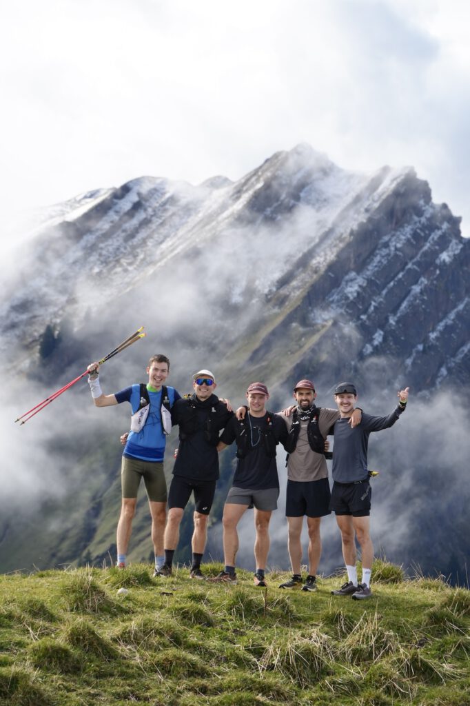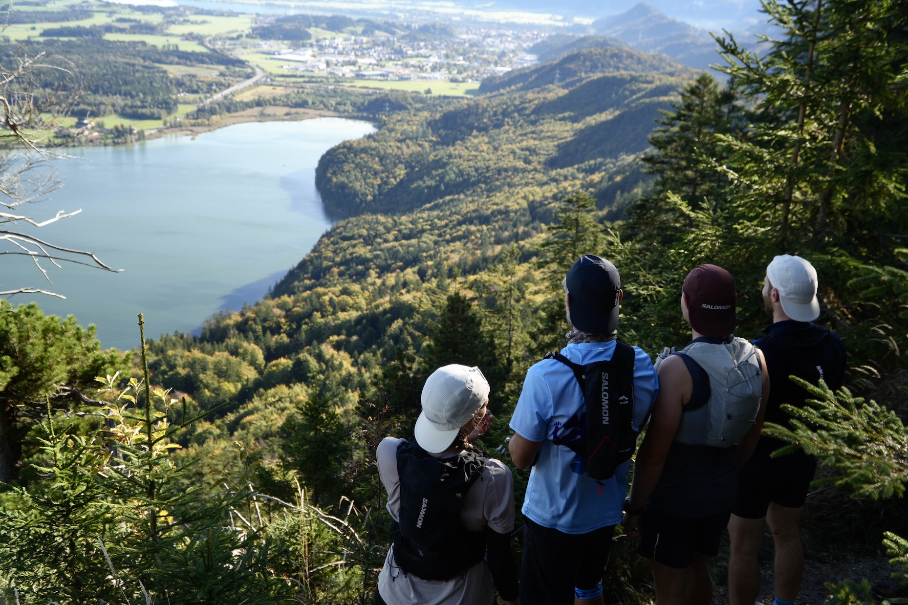 Übergabe zwei findet vor besonders beeindruckender Kulisse statt. Zwischen Touristenmassen aus aller Welt platzieren wir uns direkt vor Schloss Neuschwanstein in Hohenschwangau. Ein älterer Herr aus Pennsylvania will wissen, was wir da treiben. Wir versuchen es ihm zu erklären, aber ich glaube nicht, dass er es versteht. Er sei auch mal einen Marathon gelaufen, antwortet er platt. Nachdem wir hoch zum Schloss auf breiten Asphaltstraßen liefen, begleitet von elektromotorisierten Pferdekutschen, eröffnet sich auf dem folgenden Abschnitt das komplette Kontrastprogramm für unsere fünf Läufer. Es ist der mit knapp 40 Kilometern und über 2500 Höhenmetern längste Abschnitt der ganzen Woche. Doch damit nicht genug: Das Ammergebirge ist wild, der Hochplattengrat ausgesetzt und unlaufbar. Isa, Benni, Birger, Simon und Elias kommen nur langsam voran. Irgendwann beschließen sie, sich zu trennen und schicken die Schnellen, Simon und Elias, voran. Der Rest der Gruppe entspannt bei Sonnenschein am Forggensee, realisiert aber irgendwann mit Blick auf den Live-Verfolgungstrack, dass das heute ein sehr langer Tag wird. Schließlich steht noch eine Übergabe und ein letzter Tagesabschnitt aus.