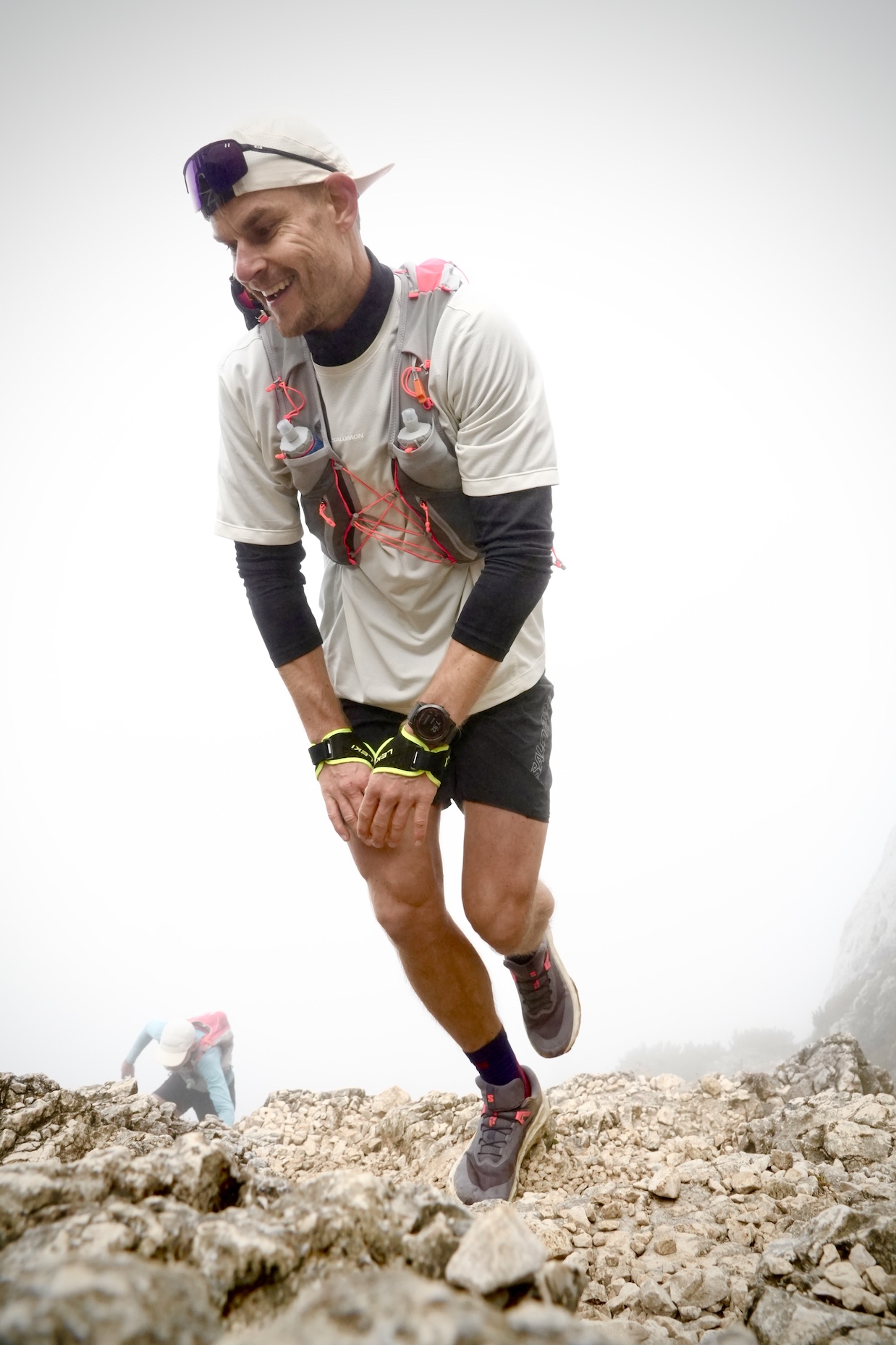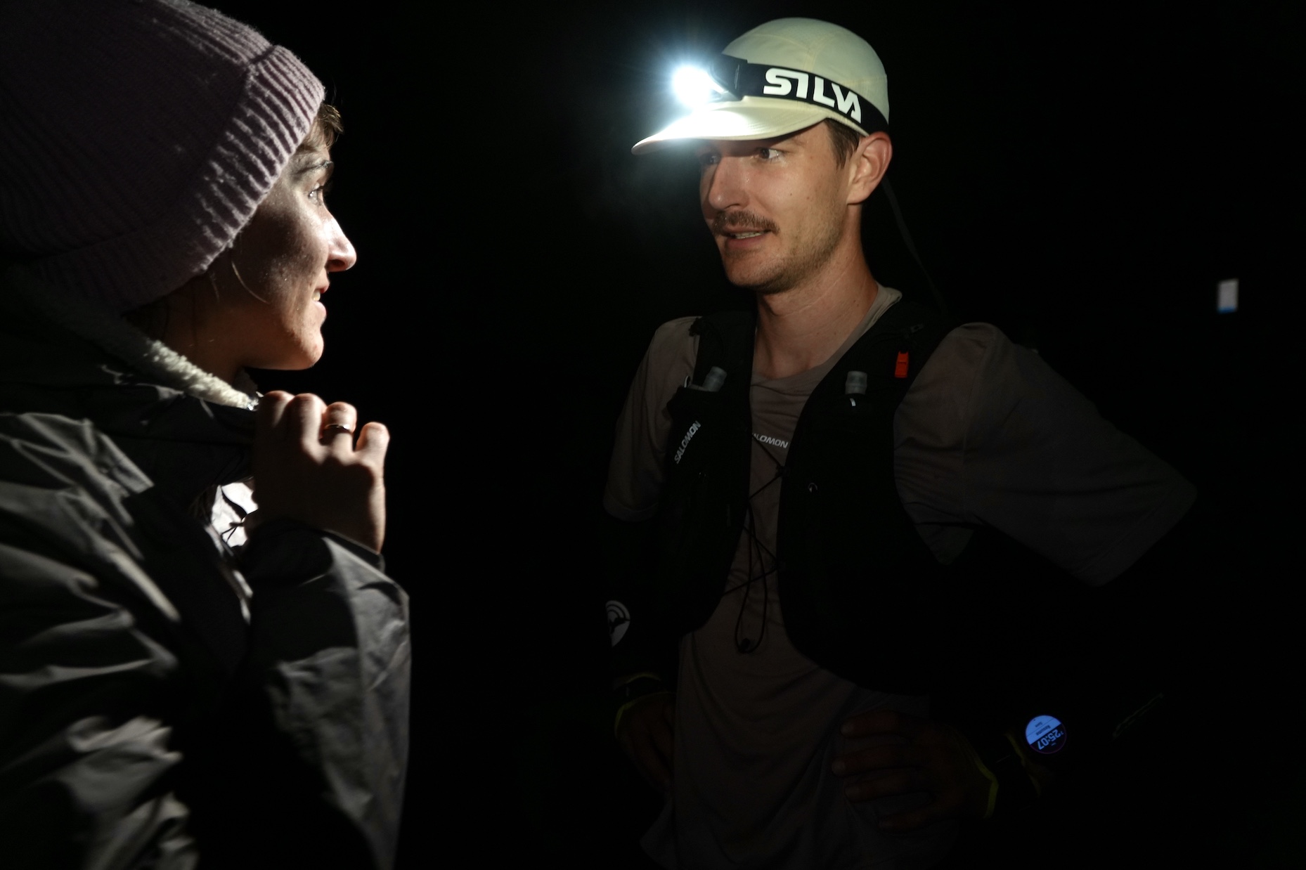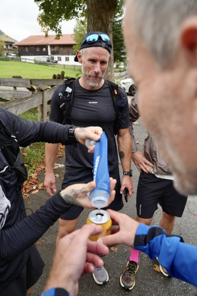 Isa, Benni und Birger sitzen inzwischen auf der offenen Pritsche des Forstmobils von Roman, einem Forstarbeiter, der sie netterweise vom Berg hinunterfährt. Ihren Anruf, wir mögen sie doch bitte abholen, können wir vor euphorischem Gelächter kaum verstehen. Simon und Elias folgen weiter dem Track und kämpfen sich über das verblockte Ammergebirge. Elias ist jung und bis in die Haarspitzen motiviert. Der Hamburger lief am Wochenende zuvor schon einen mehrtägigen Wettkampf im Schwarzwald. Im September lief er den Transalpine Run. Bei Crossing Bavaria läuft er jeden Tag mindestens zwei Tagesetappen, meist die längsten und höhenmeterreichsten.