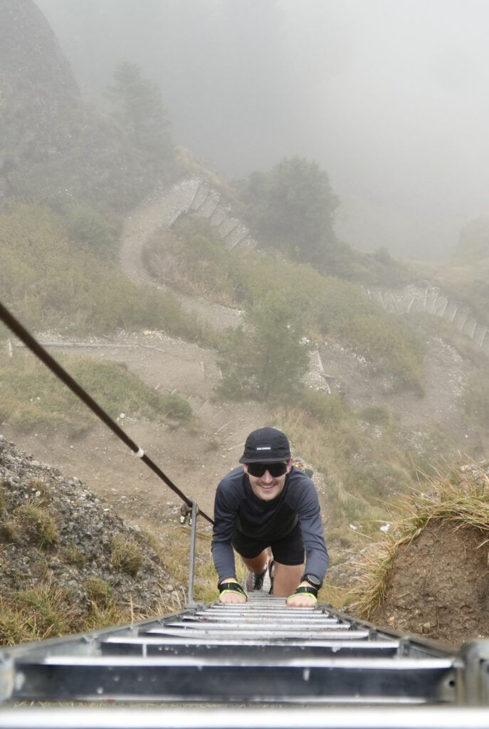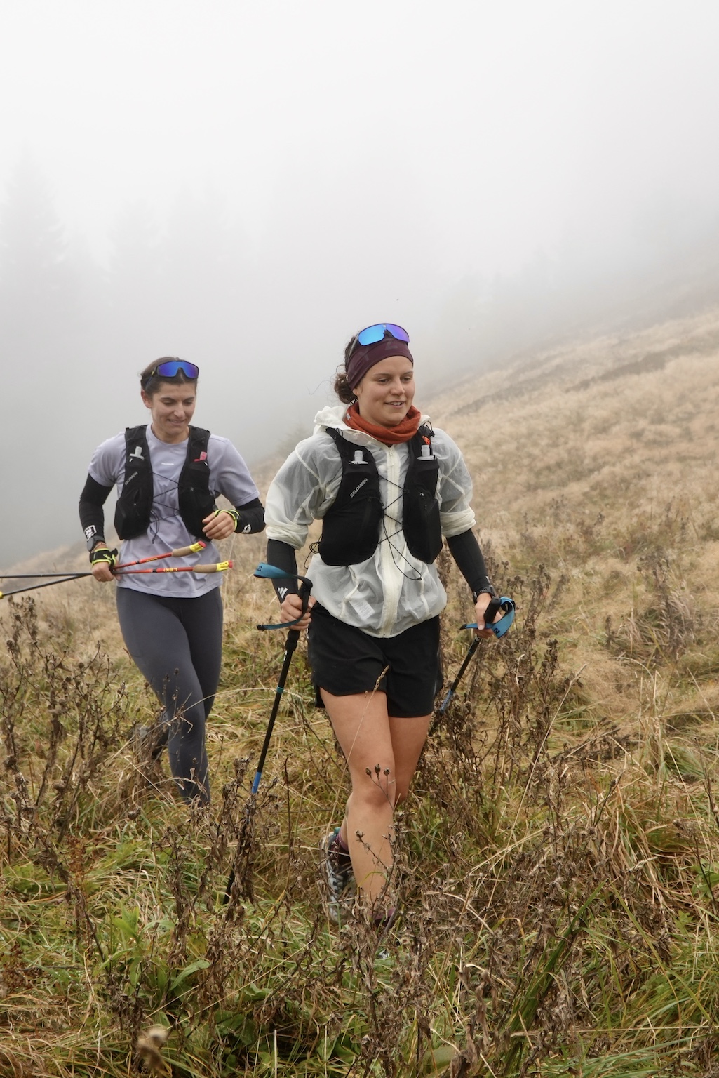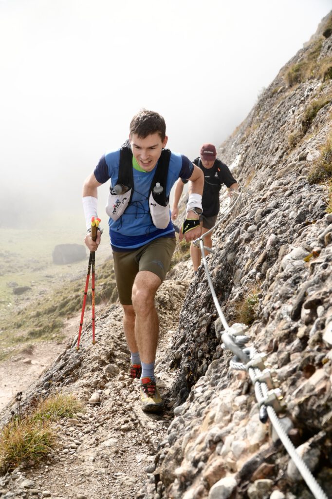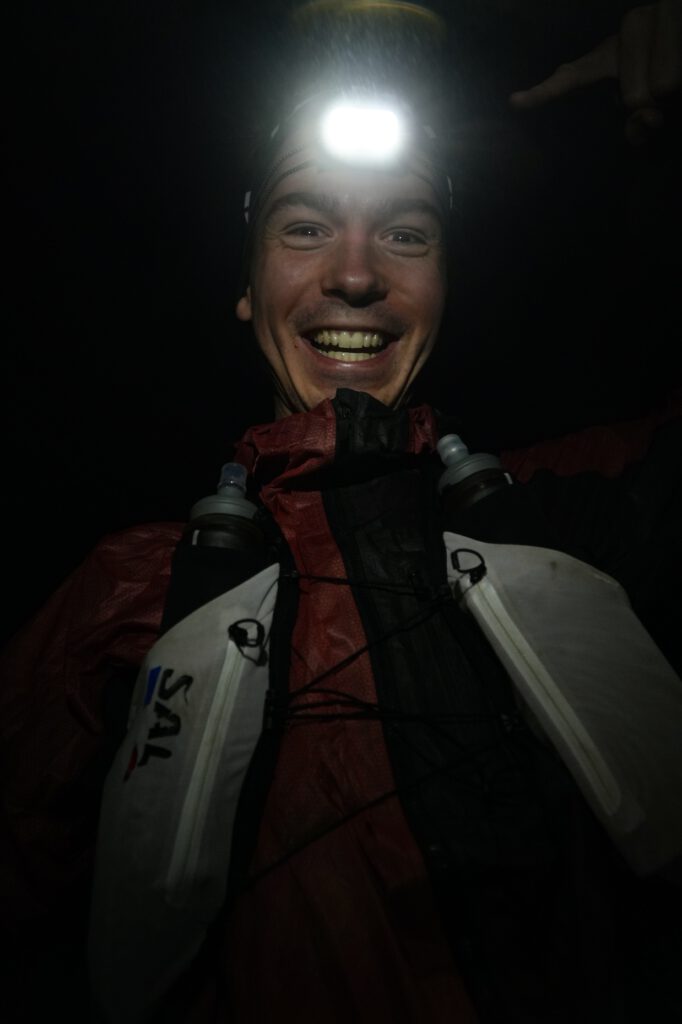 Isa, Benni und Birger sitzen inzwischen auf der offenen Pritsche des Forstmobils von Roman, einem Forstarbeiter, der sie netterweise vom Berg hinunterfährt. Ihren Anruf, wir mögen sie doch bitte abholen, können wir vor euphorischem Gelächter kaum verstehen. Simon und Elias folgen weiter dem Track und kämpfen sich über das verblockte Ammergebirge. Elias ist jung und bis in die Haarspitzen motiviert. Der Hamburger lief am Wochenende zuvor schon einen mehrtägigen Wettkampf im Schwarzwald. Im September lief er den Transalpine Run. Bei Crossing Bavaria läuft er jeden Tag mindestens zwei Tagesetappen, meist die längsten und höhenmeterreichsten.