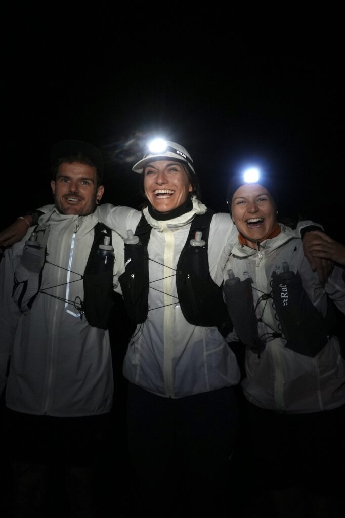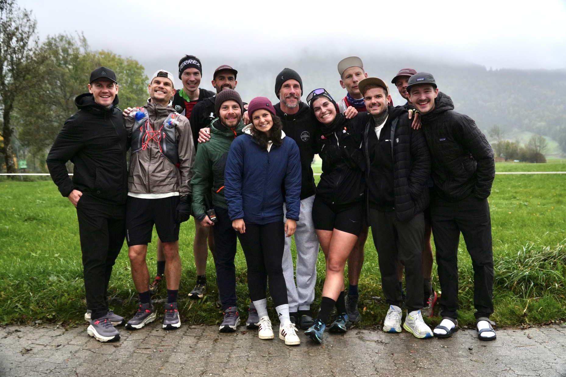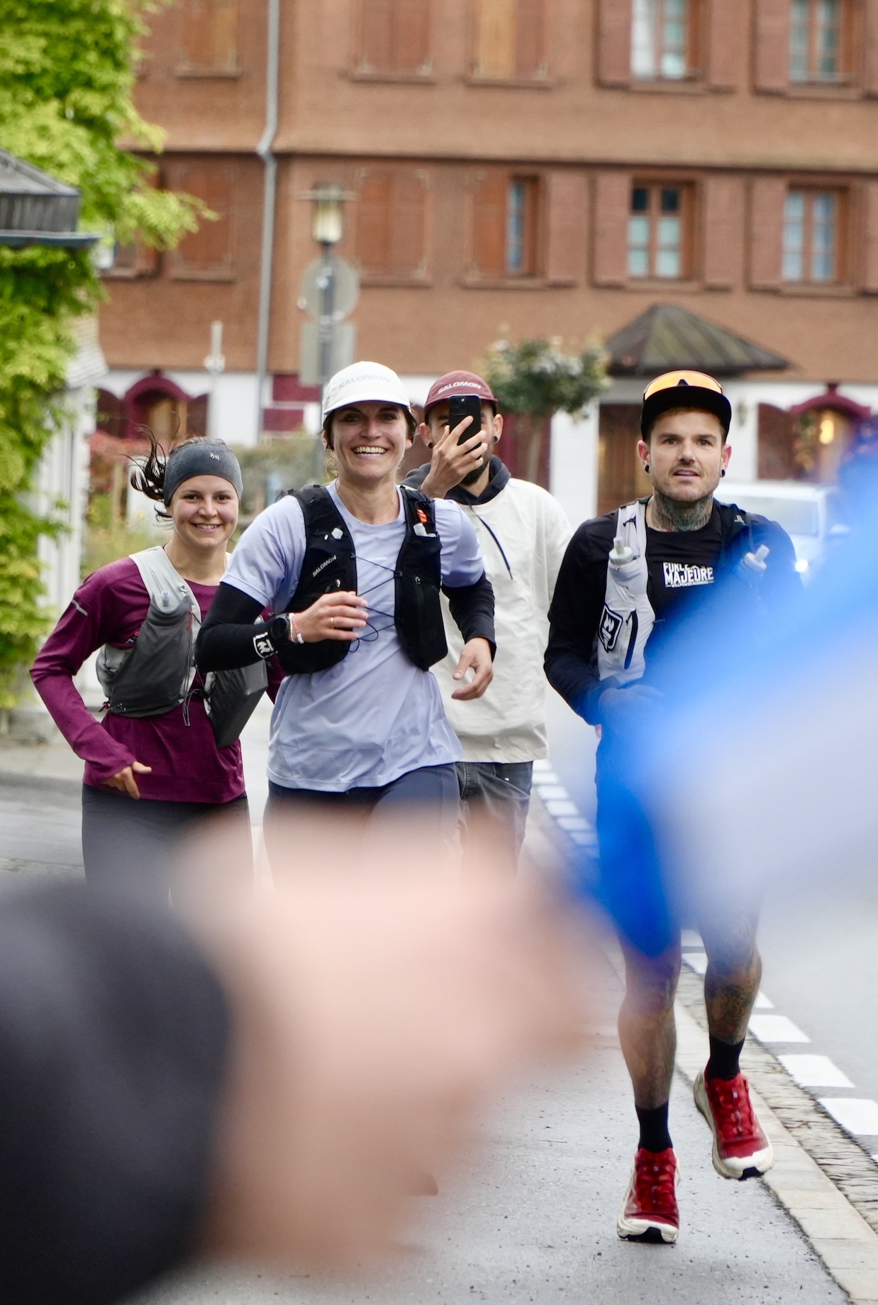 Mit Steven und Anna mache ich mich um sechs Uhr früh auf den ersten Tagesabschnitt von Tag zwei. Während wir in den malerischen Sonnenaufgang laufen, erzählt mir Anna von ihrem Redakteursjob im Berliner Springer-Verlag. Die Mutter eines vierjährigen Sohnes ist Genussläuferin und Fan unseres Vom Laufen Podcasts. Ihr gefällt der etwas andere, weniger leistungsfokussierte Zugang, den Juliane und Christian in diesem Format aufs Laufen werfen. Sie hatte großen Respekt vor der 16 Kilometer langen Morgenetappe, aber der Sonnenaufgang trägt sie bis nach Pfronten, dem ersten Übergabepunkt des Tages.