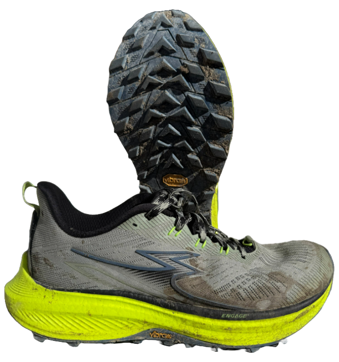 Die Zwischensohle besteht aus dem Engage Foam, einem dynamischen Dämpfungsschaum, der uns in seiner sehr soliden Performance gut gefällt. Die Sohle dämpft alles weg, was stören könnte, behält aber dennoch ein gewisses Maß an Lebendigkeit und Spritzigkeit. Diese Dämpfung fühlt sich demnach alles andere als tot an, sondern macht wirklich Freude. Gepaart mit der zuverlässigen Vibram-Außensohle haben wir ein harmonisches Gesamtpaket, bei dem die einzelnen Elemente gut aufeinander abgestimmt sind. Der Grip funktioniert bestens. Auch auf sehr steinigen und technischen Trails sind wir mit dem Schuh gut klargekommen.