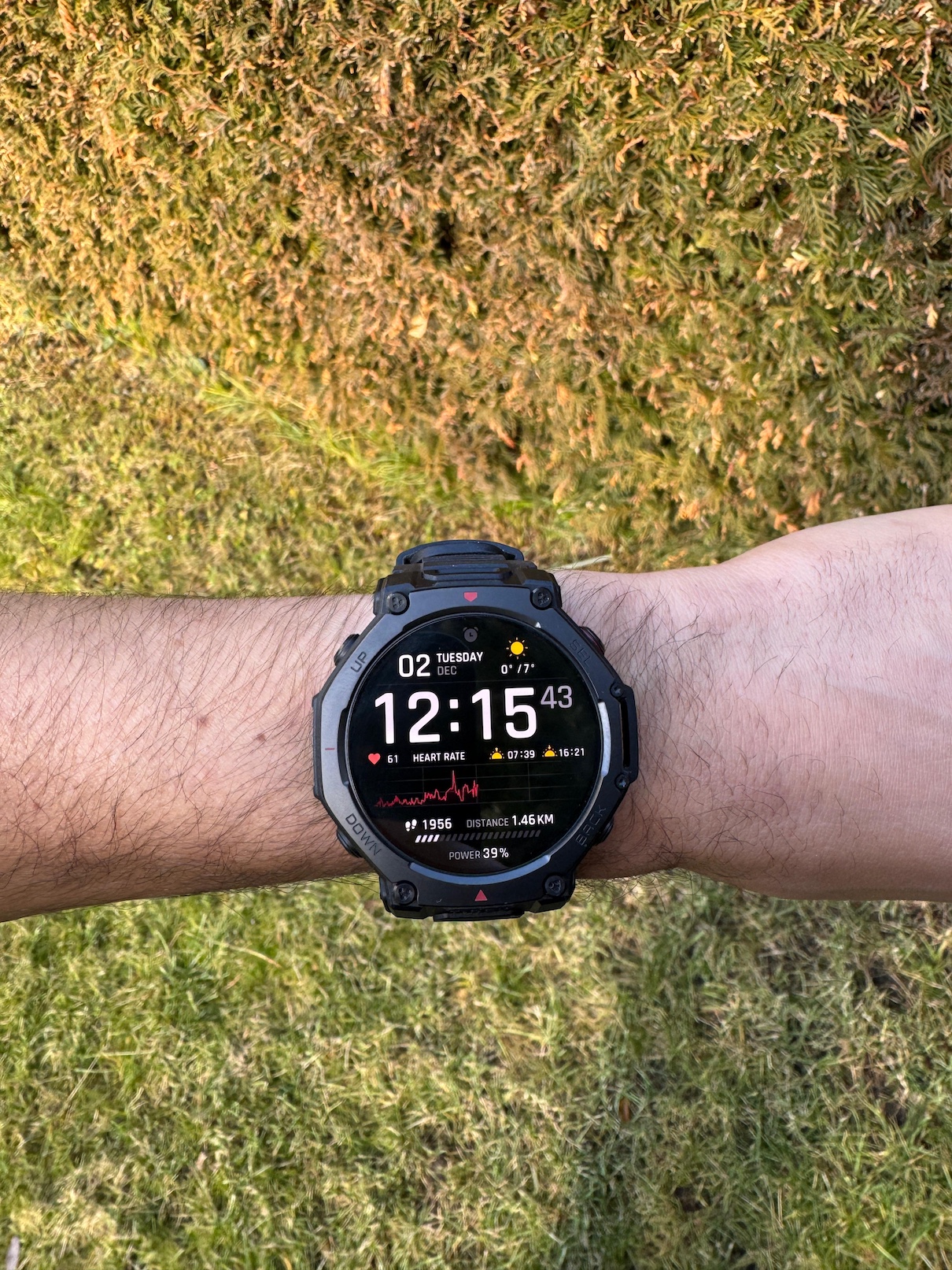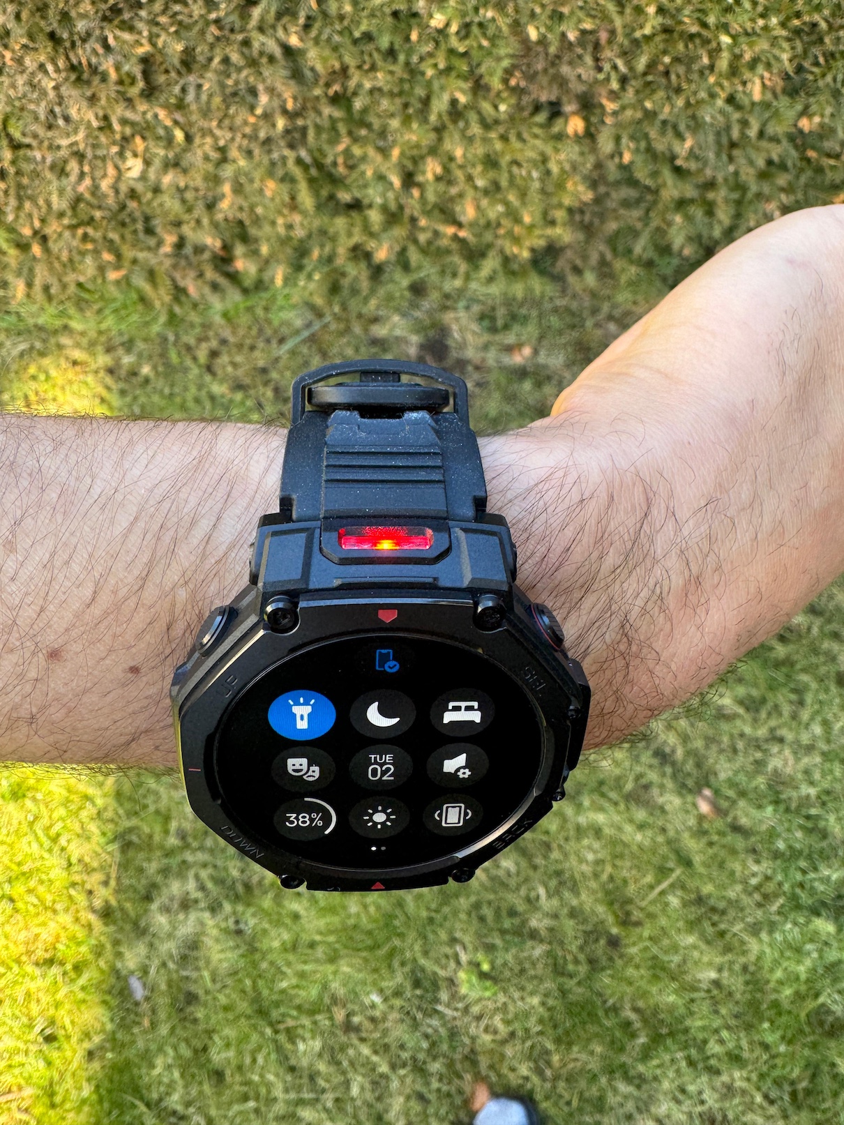 Von der Wertigkeit lässt Amazfit keine Wünsche offen: Saphirglas, Titan-Lünette und ein superhelles 3000-Nits-AMOLED-Display vereinen sich in einem vielleicht etwas zu kantigen und aggressiven Design. Aber das ist definitiv Geschmackssache. Über vier Knöpfe lässt sich die Uhr sehr gut bedienen. Allerdings haben wir bei der T-Rex Pro 3 tatsächlich fast ausschließlich den Touchscreen zum Navigieren genutzt, was super funktioniert. Vielleicht liegt das an den Smartwatch-Funktionen, die in diesem Modell stark ausgeprägt sind – dazu später mehr. Die Navigationsführung durch die Uhr ist im ersten Moment gewöhnungsbedürftig. Das kann aber auch an der Funktionsfülle und der fehlenden Gewöhnung an das neue System liegen. Nach einer Woche hatten wir uns eingegroovt.
