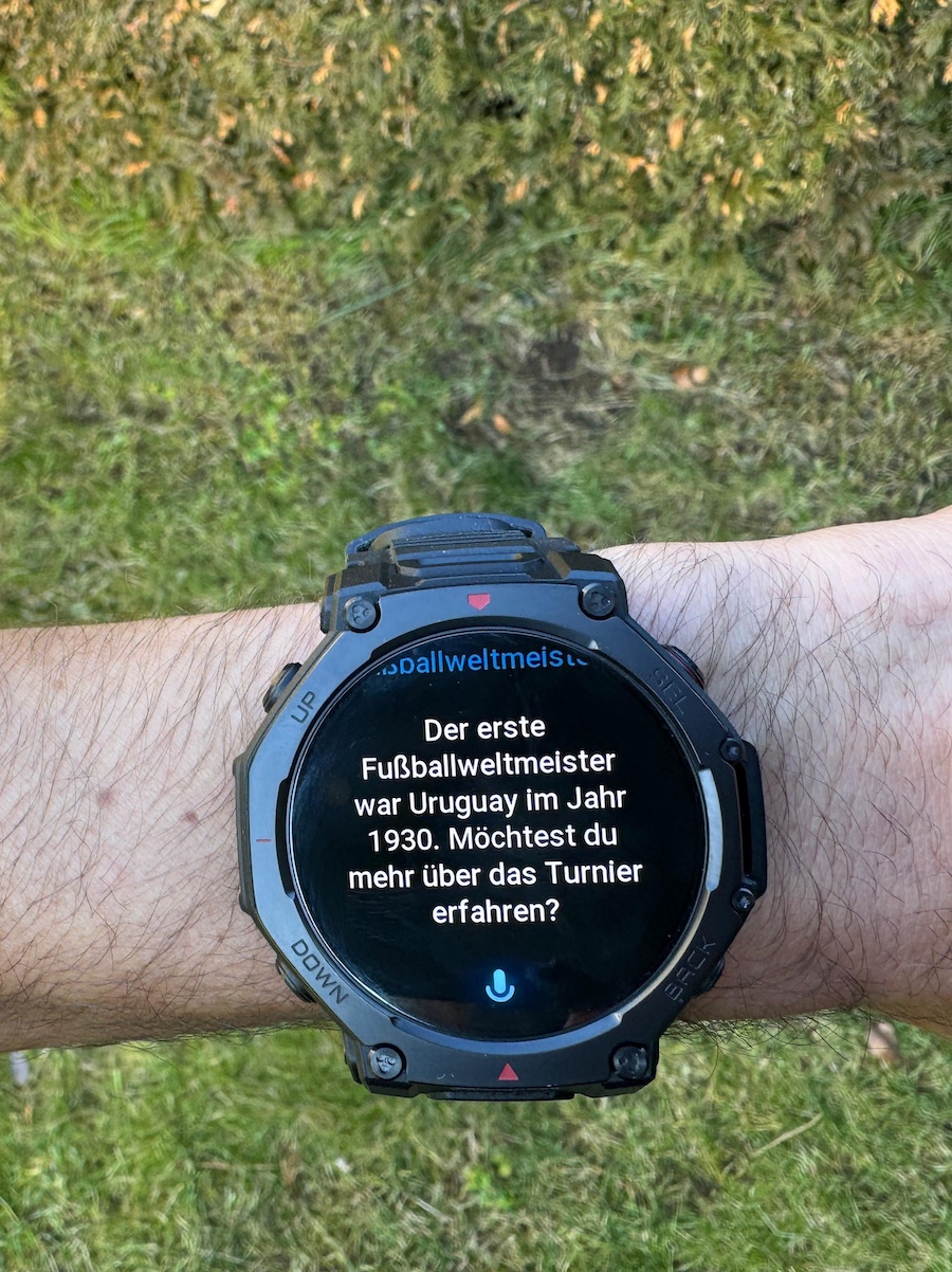 Wie im Moment nur wenige andere Konkurrenzmodelle (z.B. Garmin Fenix 8) hat die Amazfit T-Rex 3 Pro Lautsprecher und Mikrofon integriert. Diese beiden, auf einer Uhr zunächst nicht zwangsläufig notwendig wirkenden Hardware-Teile, machen die Amazfit zu einer echten Smartwatch. Klickt man lange auf den oberen rechten Knopf, öffnet sich der Zepp Flow Assistent, mit dem man tatsächlich sprechen kann. Wir haben ihn zum Beispiel genutzt, um Funktionen und Einstellungen der Uhr zu finden, weil die Menüführung (vor allem zu Beginn) doch recht sperrig ist. Das hat teilweise gut geklappt. Nur bei komplexeren Anfragen leider noch nicht. Der KI-Assistent ist auf jeden Fall noch ausbaufähig, wer der erste Fußballweltmeister war, hat uns die nette Frauenstimme aber zuverlässig verraten. Da in diesem Feld sehr schnell Fortschritte erzielt werden, kann man erwarten, dass die Zepp Flow KI durch fortlaufende Softwareaktualisierungen stetig verbessert wird.