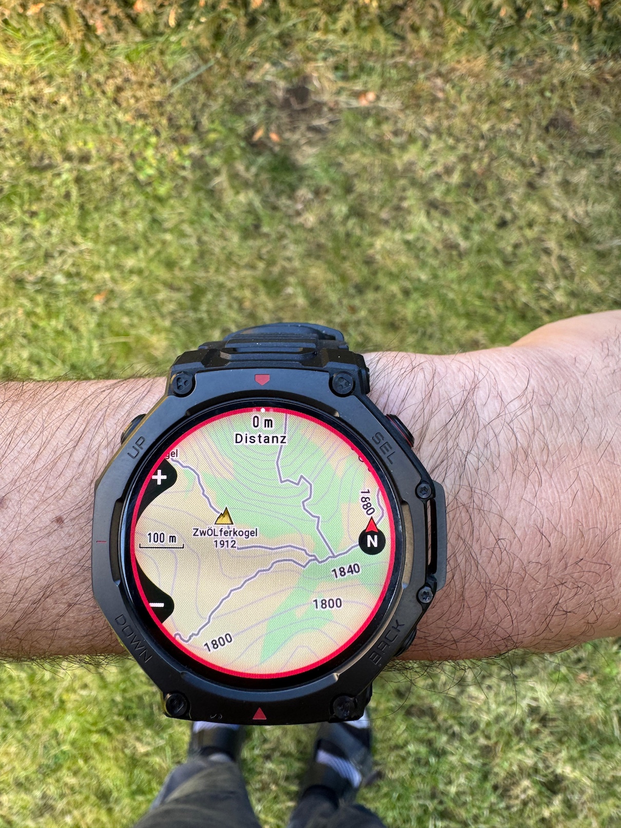 Die Karte ist detailreich und optisch ansprechend. Cool für Trailrunner: Höhenlinien mit Höhenangaben werden genauso angezeigt wie Gipfelnamen. Weniger cool für Trailrunner: Eine Unterscheidung zwischen Forststraße und Trail wird nicht gemacht. Die Karten sind zu Beginn nicht automatisch auf der Uhr, sondern müssen manuell heruntergeladen werden. Dies dauert je nach gewähltem Kartenausschnitt ein paar Minuten. Neben Garmin ist Amazfit die einzige Marke, die intelligentes Routing anbietet. Das heißt, die Uhr weiß, wo auf der Karte man sich gerade befindet, und kann deswegen Points of Interest (Supermärkte, Tankstellen und vieles mehr) identifizieren. Auch das Zurücknavigieren zum Startpunkt ist möglich. Nur das automatisierte Erstellen neuer Routen über die Angabe weniger Parameter ist (noch) nicht möglich.