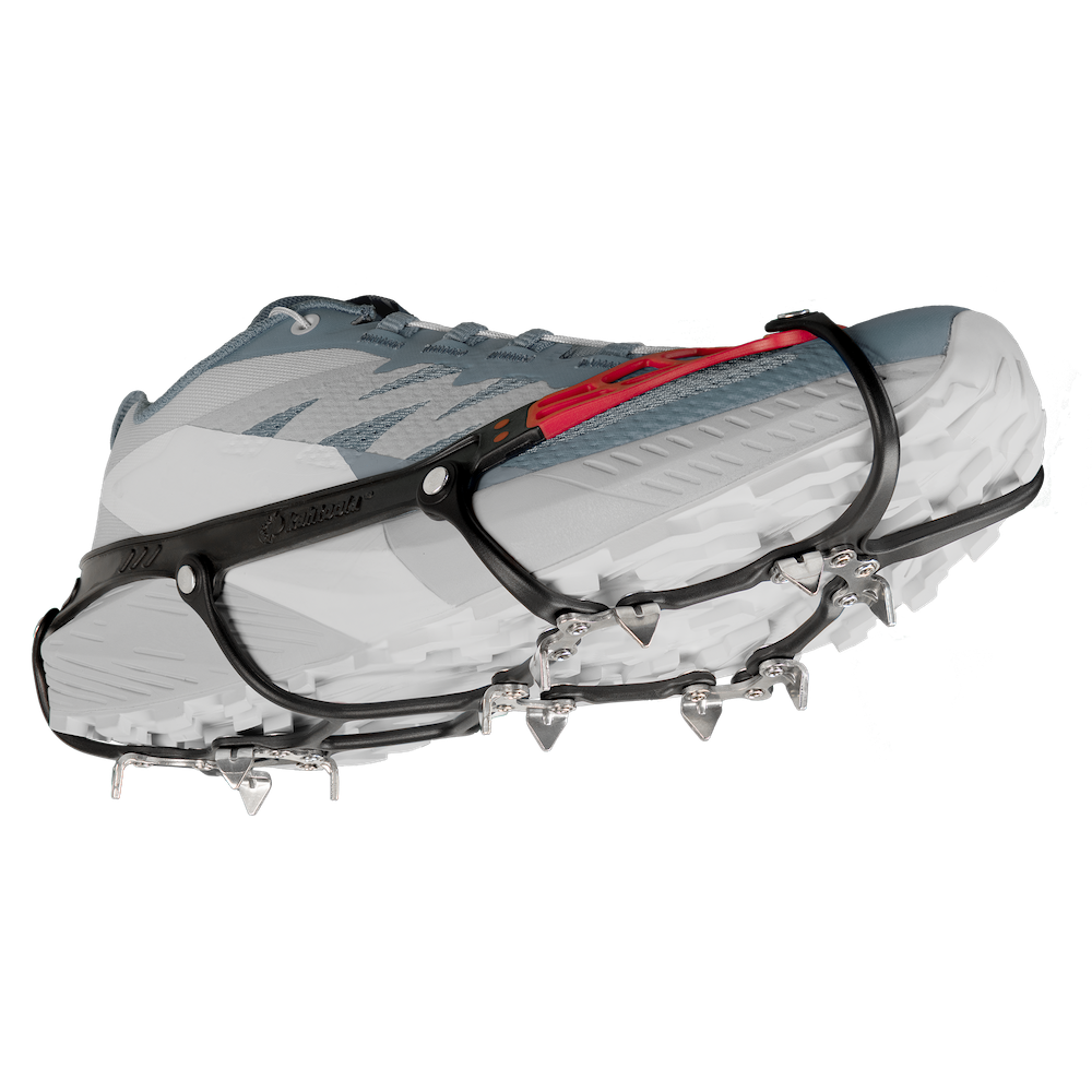 Wie wurde das möglich? Vor allem durch den Verzicht auf die sonst üblichen Metallketten unter dem Fuß. Stattdessen setzt Kahtoola auf einen sehr robusten und widerstandsfähigen Kunststoff auf TPU-Basis. An diesem sind die Spikes befestigt, an drei Stellen sogar über eine clevere Scharnierkonstruktion, die dafür sorgt, dass die Spikes untereinander beweglich bleiben. Insgesamt kommen 12 Metallspitzen zum Einsatz. Oben sorgt ein elastisches Material inklusive rotem Körbchen im Vorderfußbereich dafür, dass die Spikes sicher am Schuh sitzen.