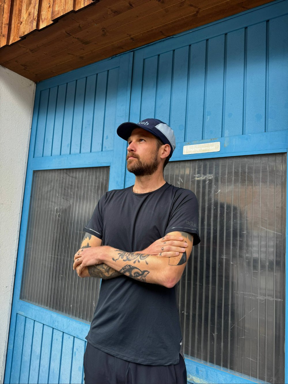 Christian von Alles Laufbar posiert im (nassen) Sonic Ultra T-Shirt von Rab